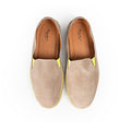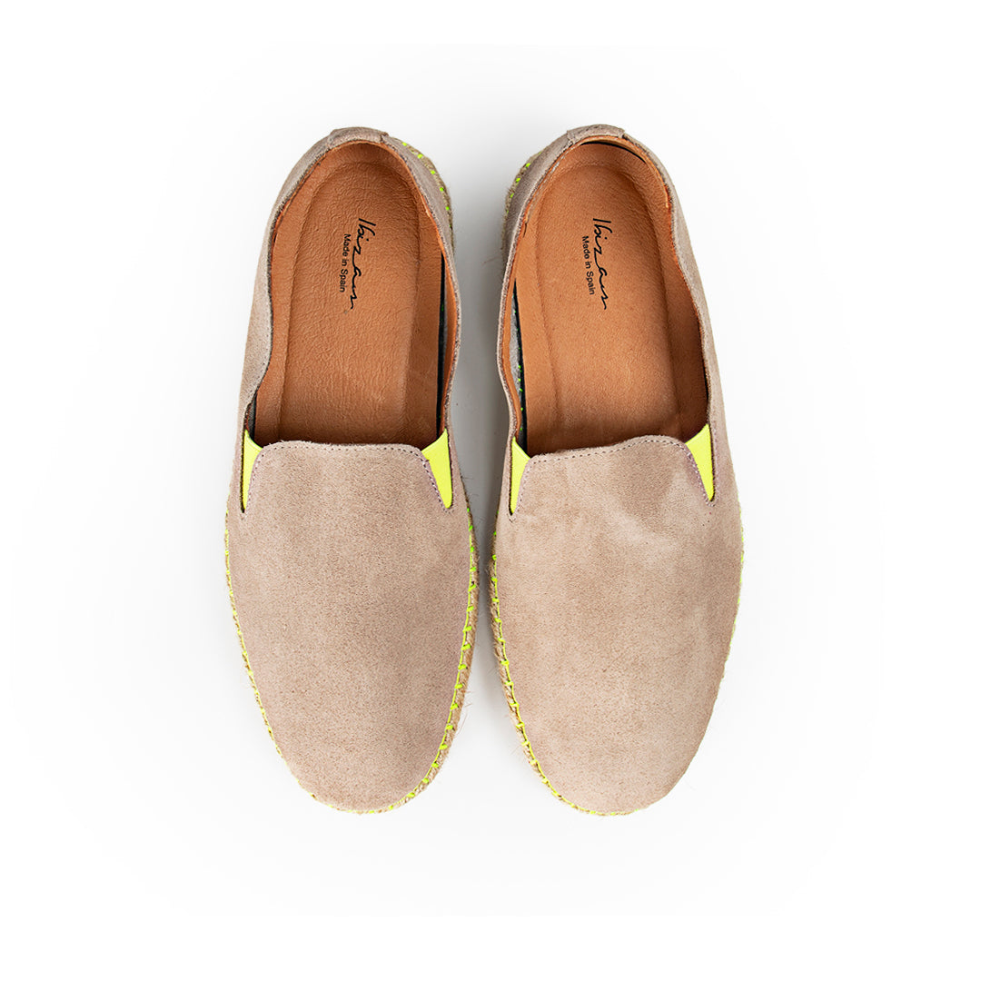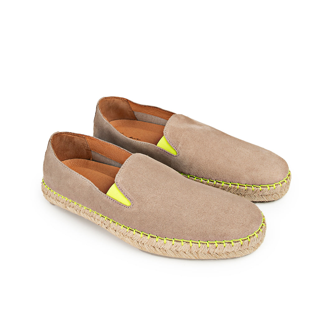 Espardeña de hombre con elásticos flúor en contraste con la piel de serraje en color piedra. Un calzado clásico masculino con un toque moderno. Mocasines de verano CAVALLET, fabricados con suela de yute y caucho natural.